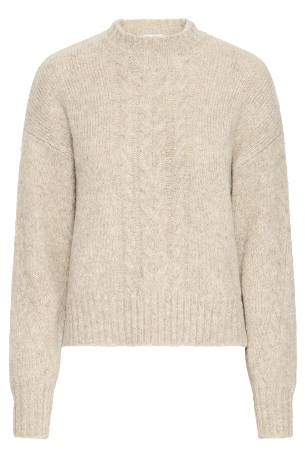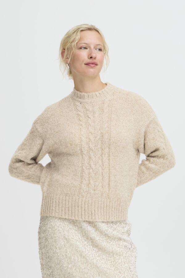 Add some sparkle to your life with the B.Young Onorma Glitter Cable Knit Jumper. It features cable knit detailing to the front, a high round neck, a metallic finish and full length sleeves. Wear yours with a midi skirt or smart dark wash jeans this season.