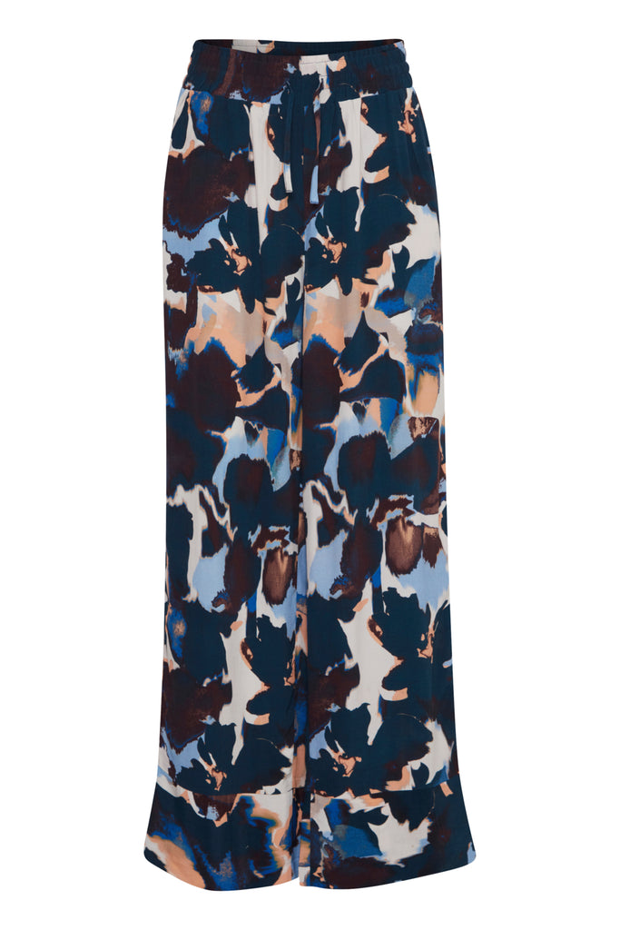 Taya Pants by Fransa, in a vibrant blue marble mix with an elasticated waist and flattering wide leg