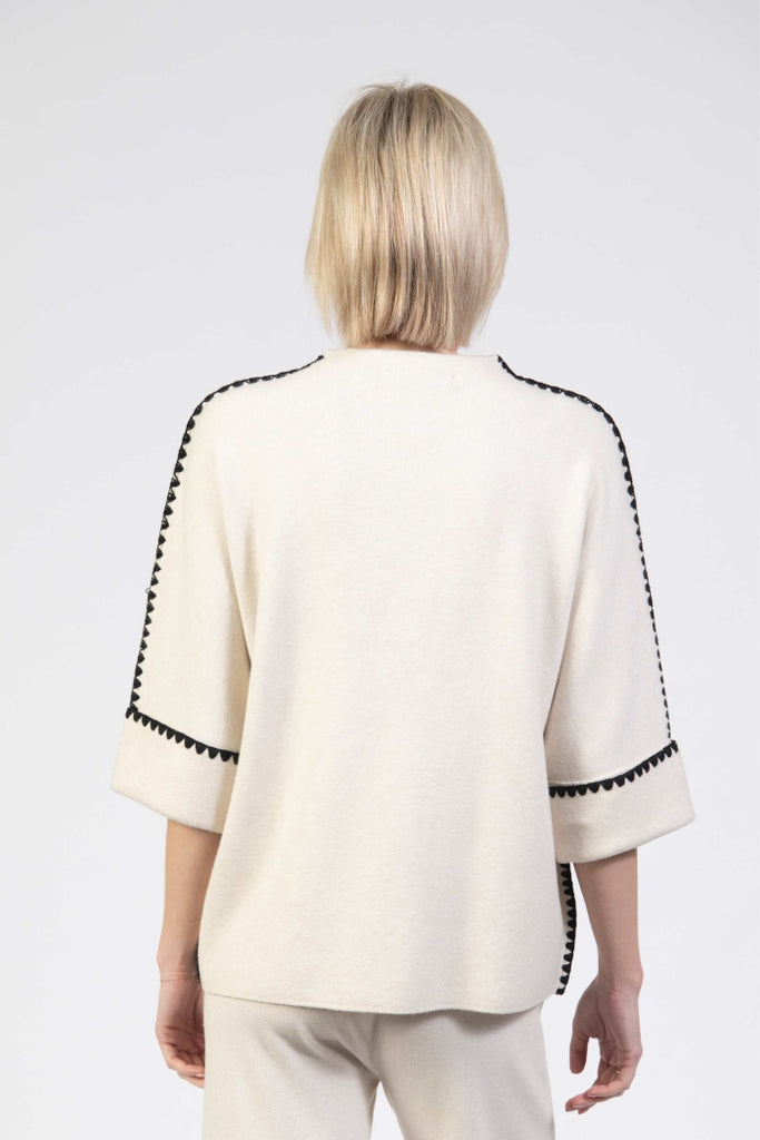 We love this ultra soft jumper and we know you will too. The Jessica Graaf Contrast Blanket Stitch Jumper features a detailed stitch running down the side of the arms to add contrast and detail to the knit. It has a 3/4 length sleeve and a hip length, slightly oversized style.