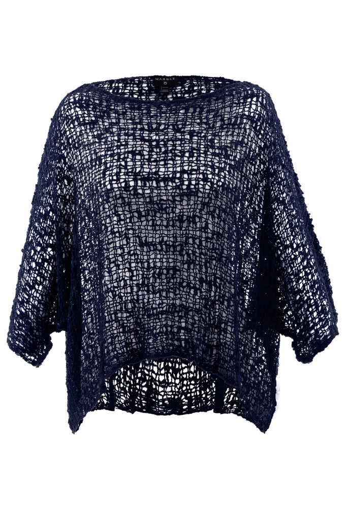 Created in a soft crochet loose knit, the top is designed in Navy with short sleeve batwing style. Perfect for wearing with a vest top or long sleeve top, jeans or dress up with trousers.