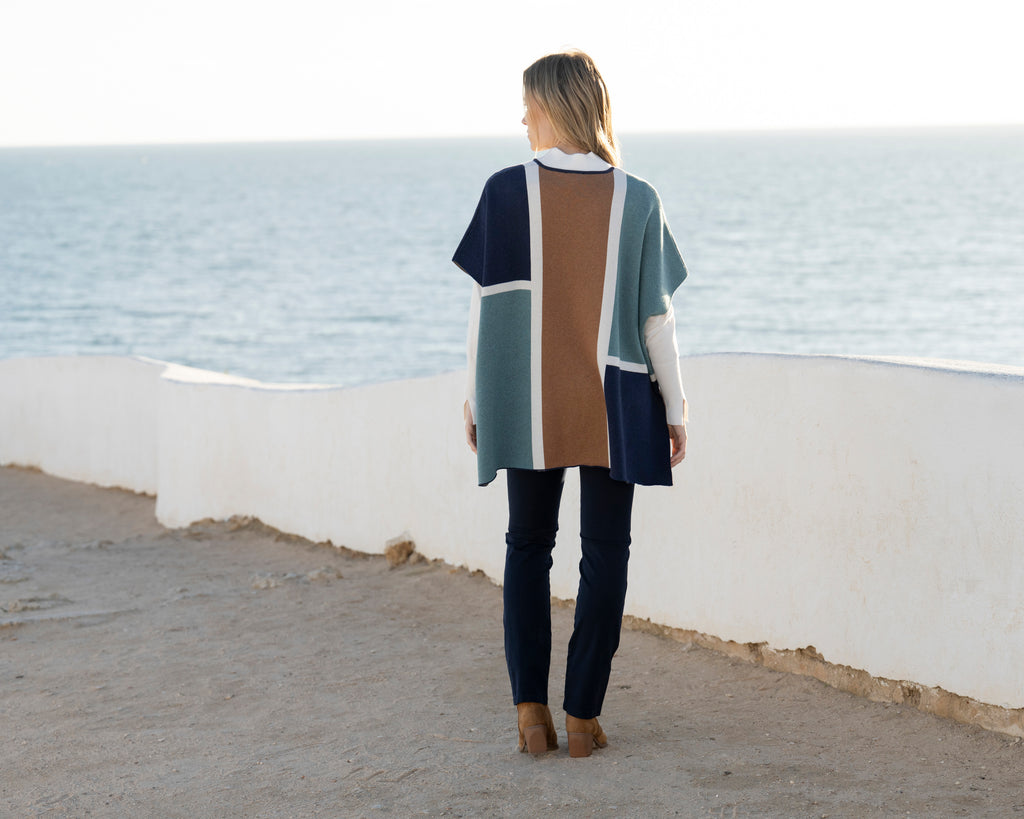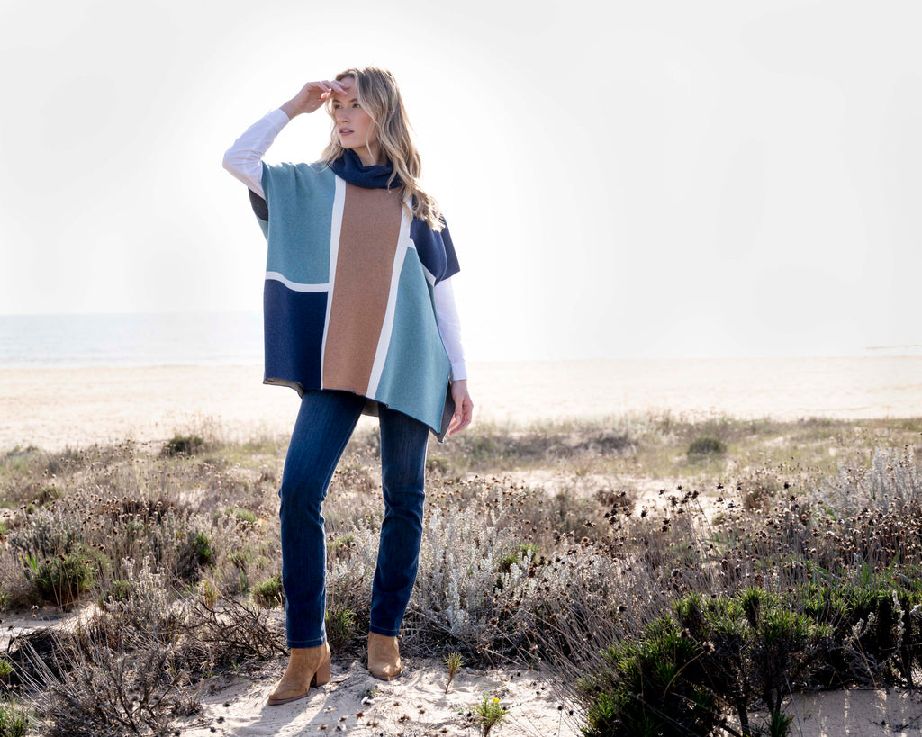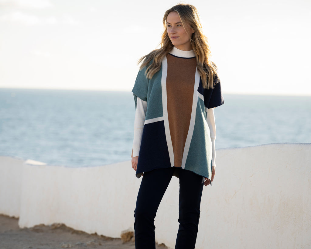 Marble's colour block trend is one of our favourites and we love this layering piece for the colder weather. Using a combination of bold seafoam blue, deep navy, crisp white and warm tan, this sleeveless cape style jumper with detachable cowl can be worn with your favourite jeans and boots.
