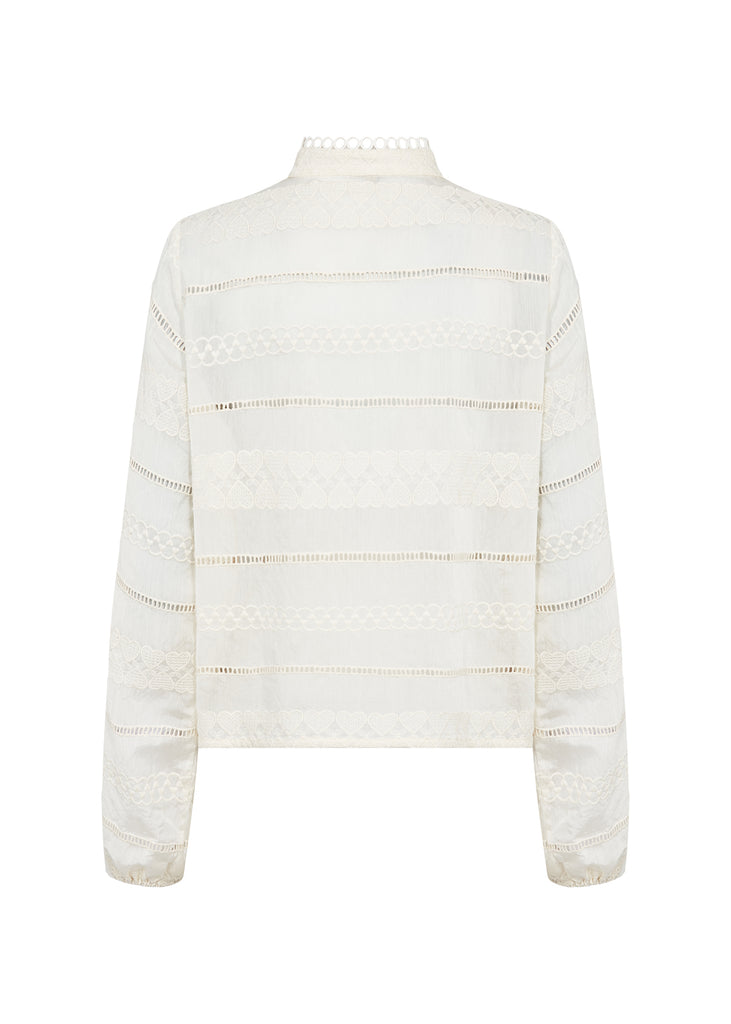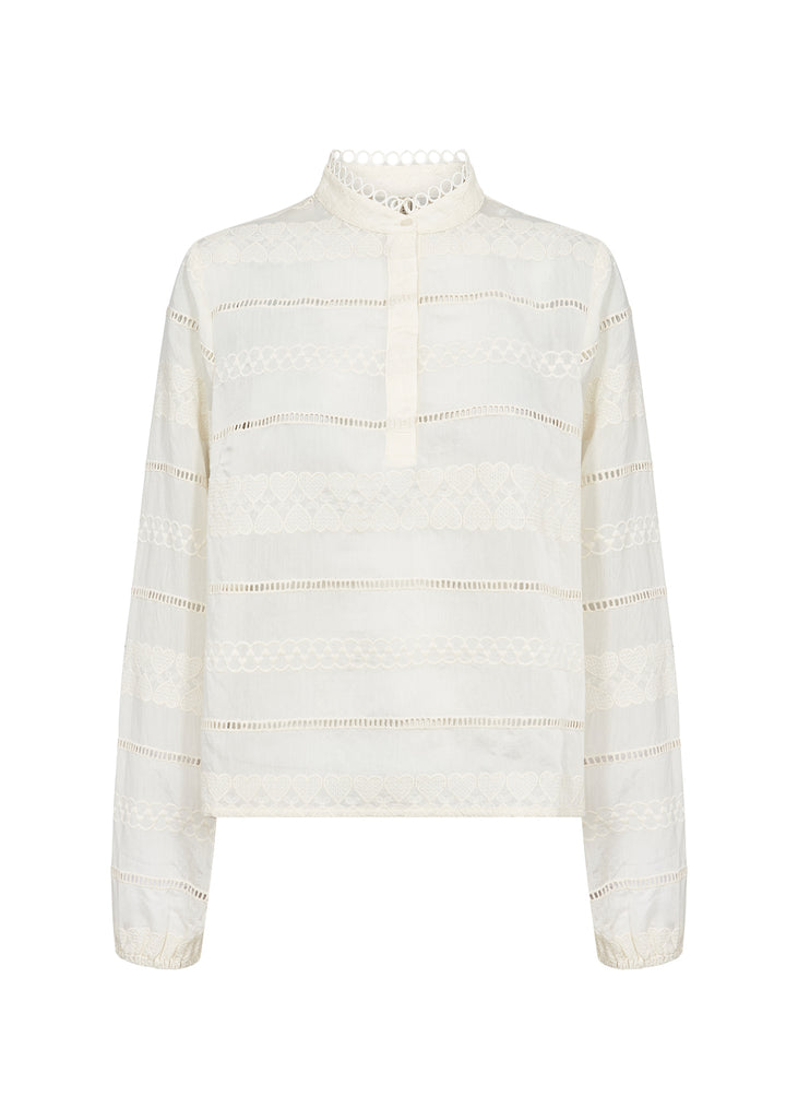 Introducing the Soyaconcept Ava Lace Blouse. This elegant blouse features delicate lace detailing, a stand collar, and comfortable long sleeves. Pair it with tailored pants for a sophisticated look or jeans for a casual style.