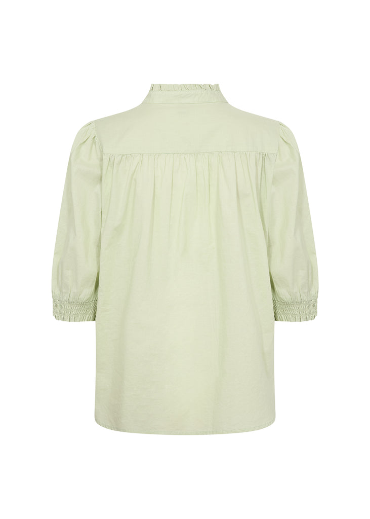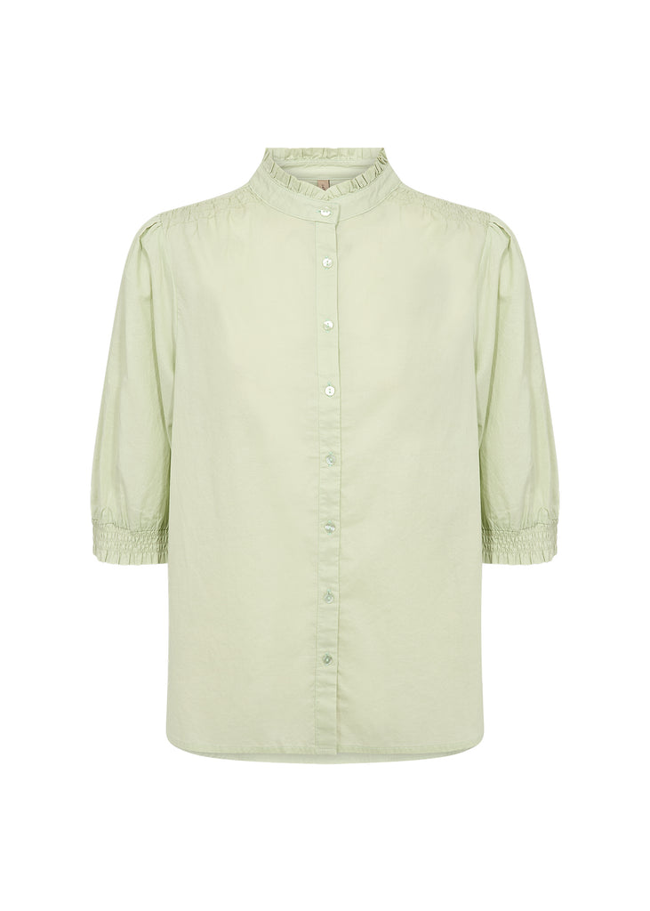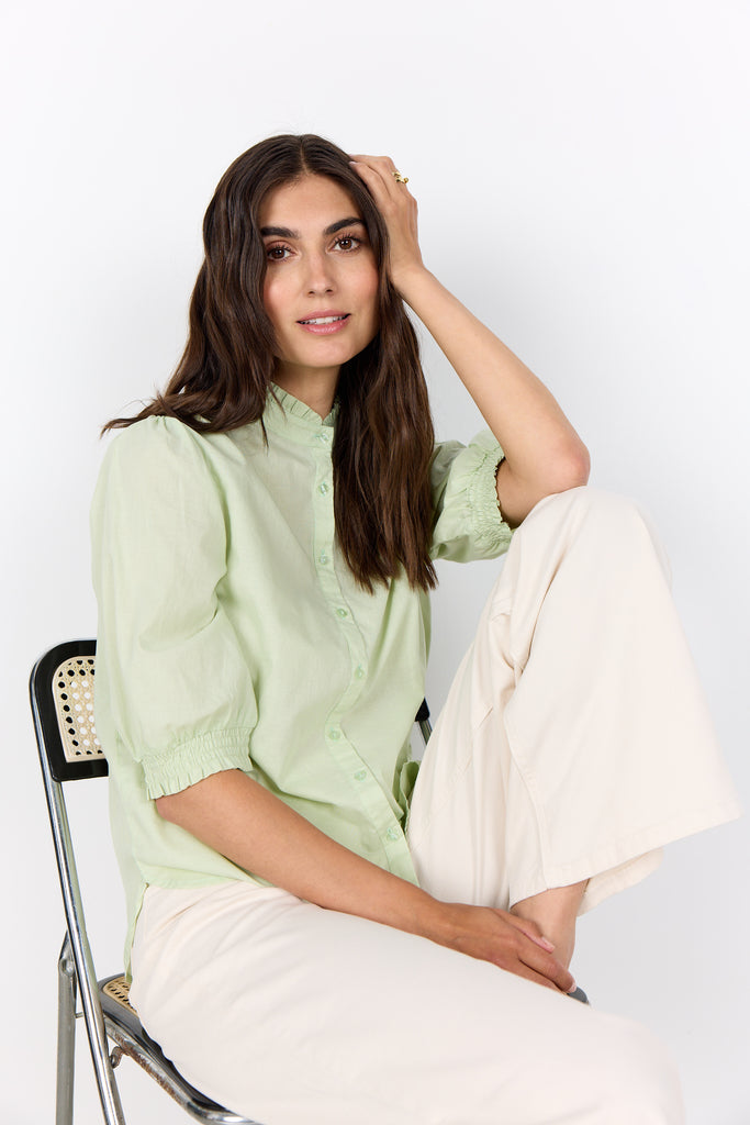 The Soyaconcept Carliste Frill Neck Blouse features a stylish mandarin collar, button-down front, and elasticated cuffs for a polished finish. Made from soft organic cotton in a minty green shade, it pairs effortlessly with tailored trousers or your favourite jeans.